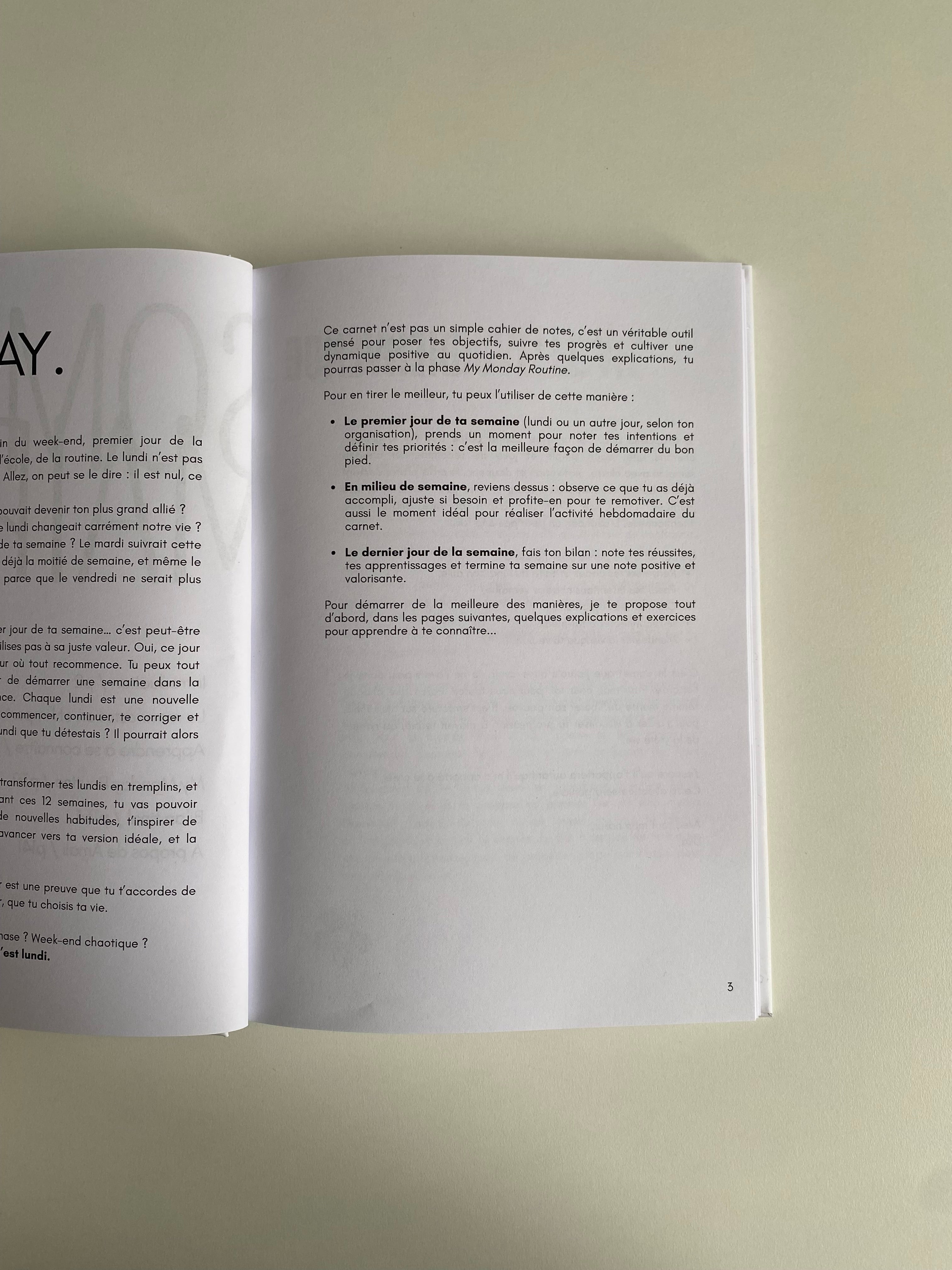 Le Monday Journal est un véritable compagnon d’évolution personnelle. Pensé pour être rempli 2 à 7 fois par semaine, il s’adapte totalement à ton quotidien, et t’accompagne pas à pas vers une vie saine, équilibrée et organisée. En seulement trois mois, il t’aide à transformer ton quotidien :